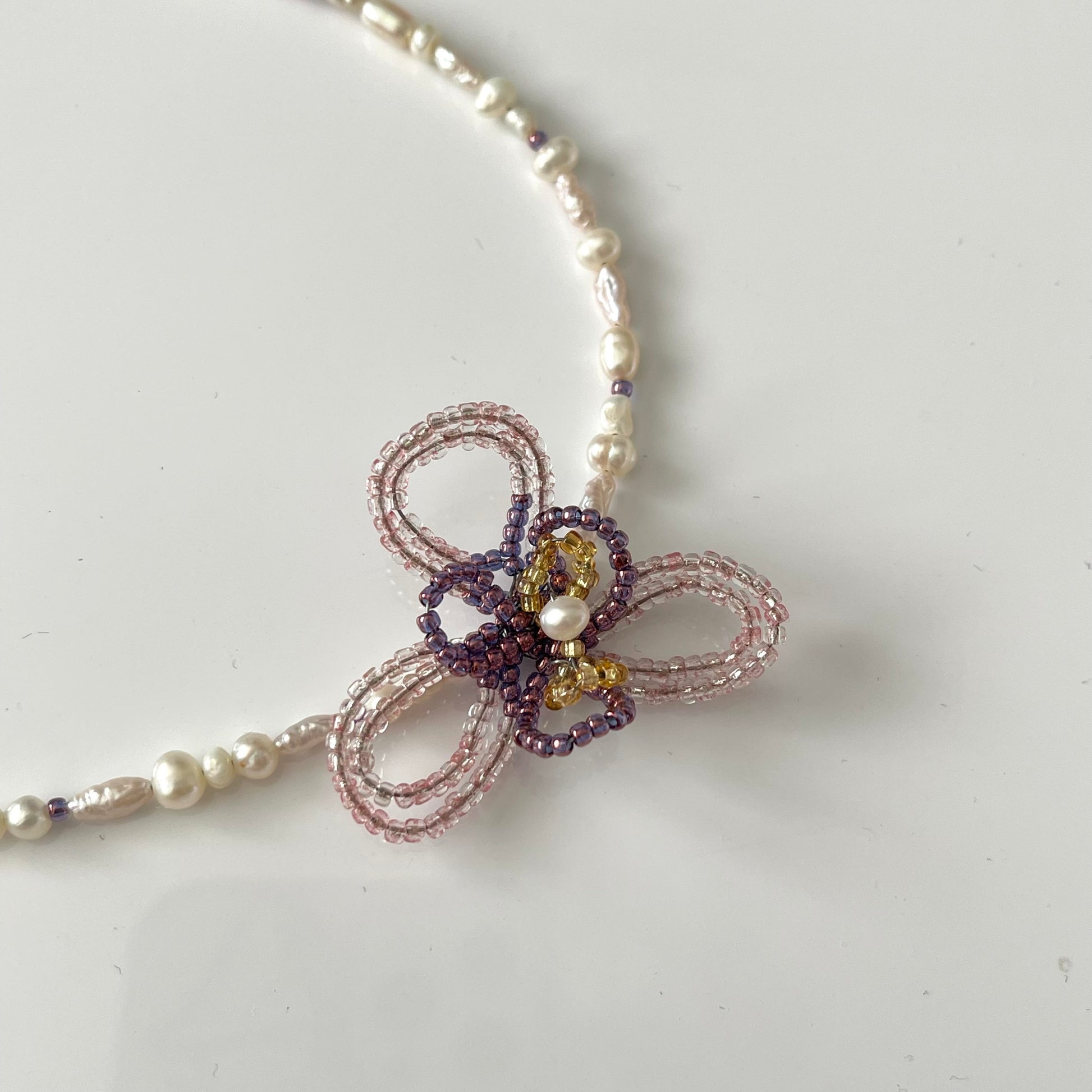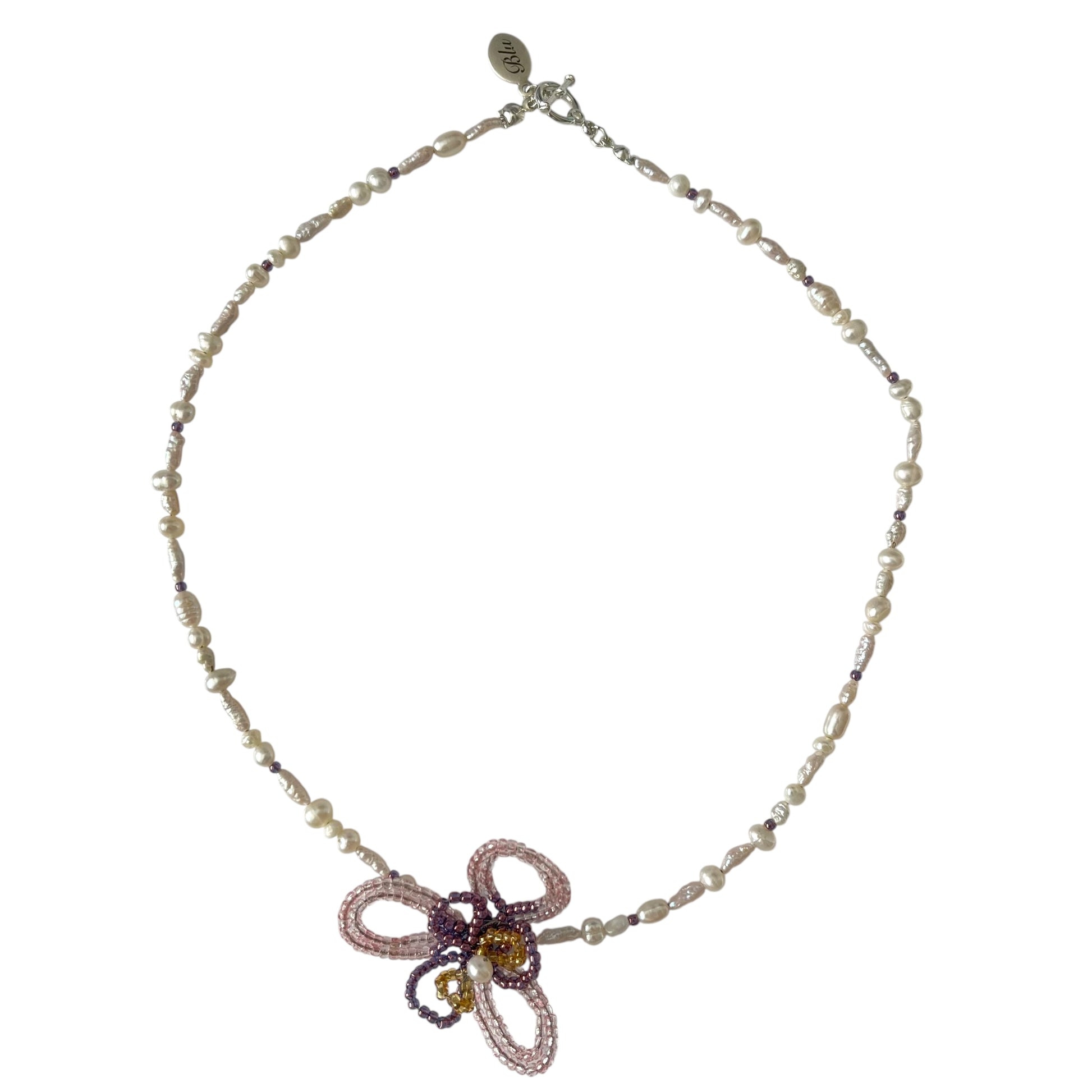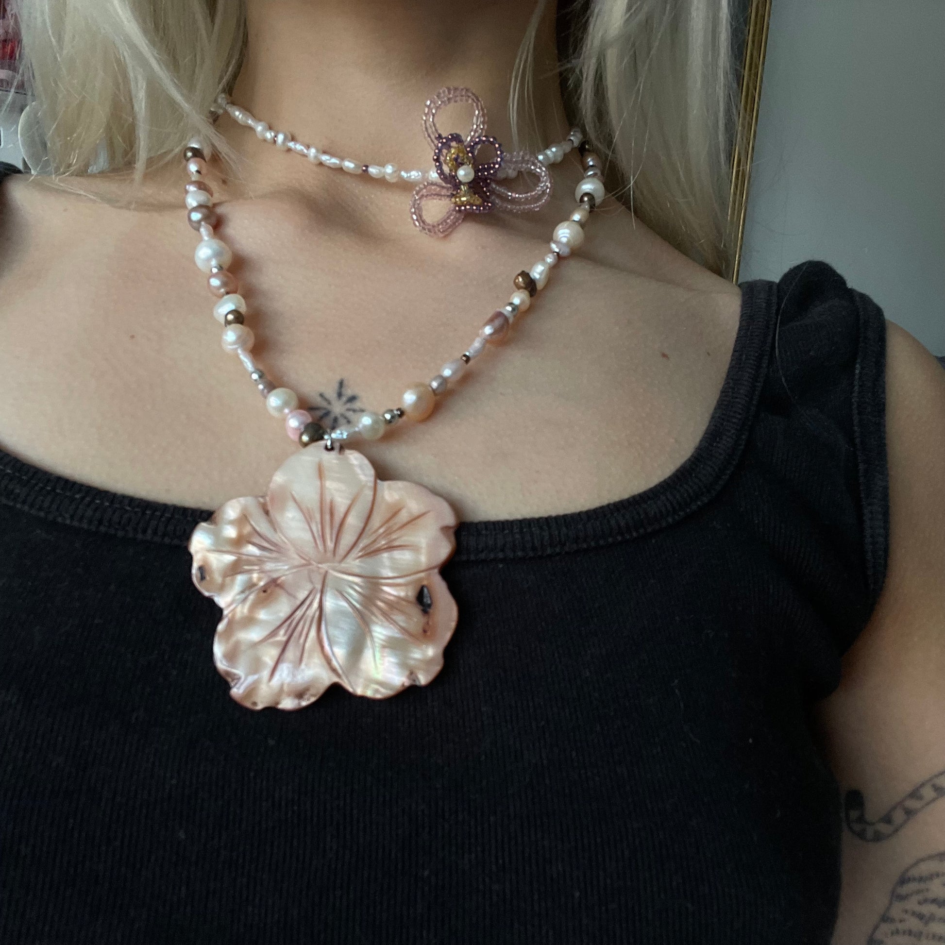 Beaded necklace made with freshwater pearls and a handmade flower pendant