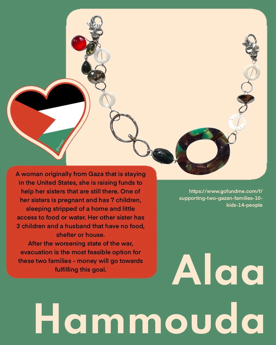 Alaa Hammouda - A woman originally from Gaza that is staying in the United States, she is raising funds to help her sisters that are still there. One of her sisters is pregnant and has 7 children, sleeping stripped of a home and little access to food or water. Her other sister has 3 children and a husband that have no food, shelter or house. After the worsening state of the war, evacuation is the most feasible option for these two families - money will go towards fulfilling this goal.