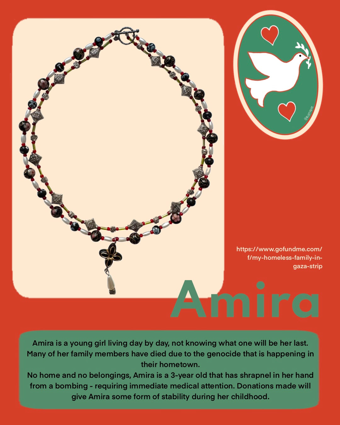 Amira - Amira is a young girl living day by day, not knowing what one will be her last. Many of her family members have died due to the genocide that is happening in their hometown. No home and no belongings, Amira is a 3-year old that has shrapnel in her hand from a bombing - requiring immediate medical attention. Donations made will give Amira some form of stability during her childhood.