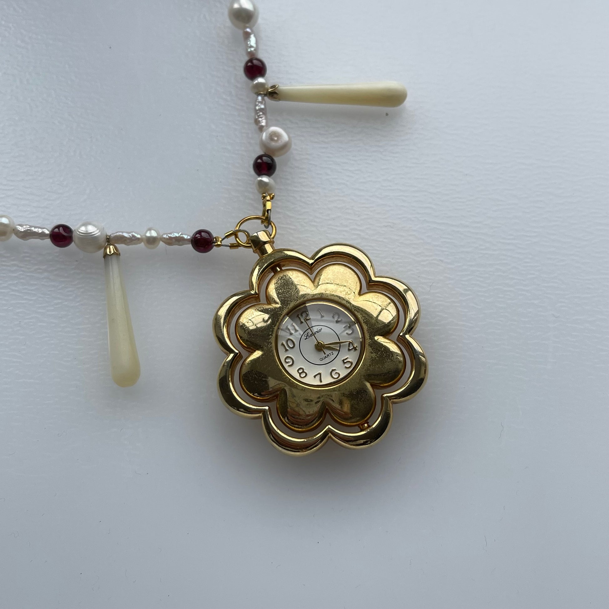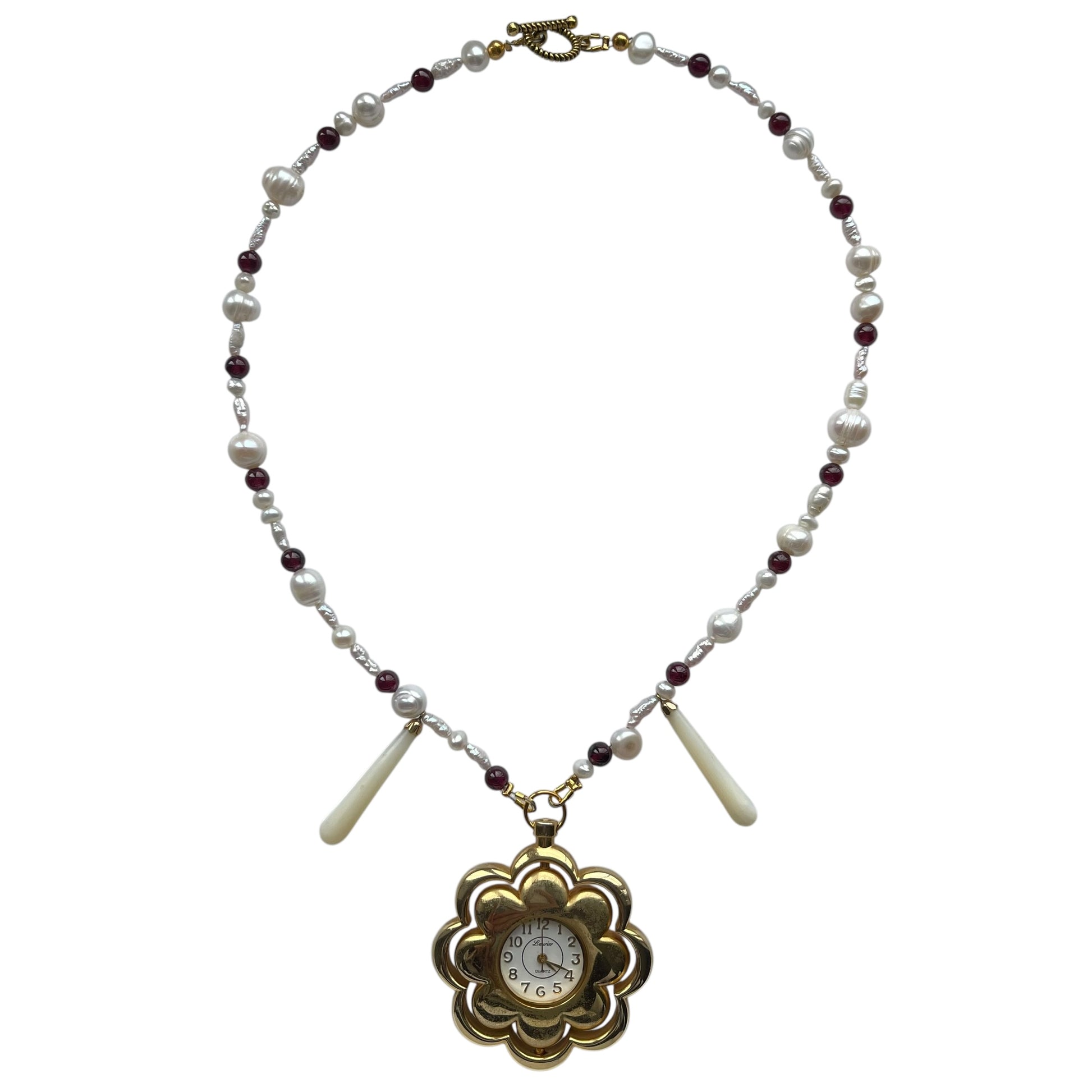 Featuring: freshwater pearls, hand sourced vintage floral clock locket